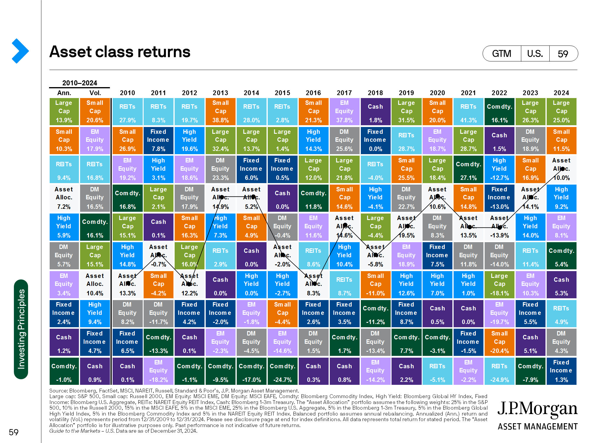 The “Periodic Table” below shows the asset class returns ranked in order for each year since 2010. The S&P Index (represented by the green color on the chart below) performed remarkably well over the past 2 years. In fact, only one asset class (commodities) had a negative return during that same timeframe. That is quite a contrast to 2022 when only 2 asset classes (commodities and cash) had positive returns. We would love to be able to control what the equity markets are going to do, but that is not a resolution we could keep. We can control your asset allocation. That is the mix of the different asset classes that is based on the timeframe of your goals, when distributions will be needed, and your risk tolerance. Asset Allocation (the white box with the line represents a mix of different investment indices) returns will never be at the top, but more importantly, will never be at the bottom. The technical investment term for this is managing downside risk. Asset allocation also allows us to control the discipline needed to rebalance a portfolio. Rebalancing is counterintuitive because you are selling investments that have gone up and buying ones that have declined. It is not easy, but it is extremely important so your investment portfolio is not subject to a higher degree of risk than you would be comfortable with. Finally, your role in allowing us to control what we can control is to let us know if any of your financial goals have changed and most importantly, if any planned distribution needs have been modified.